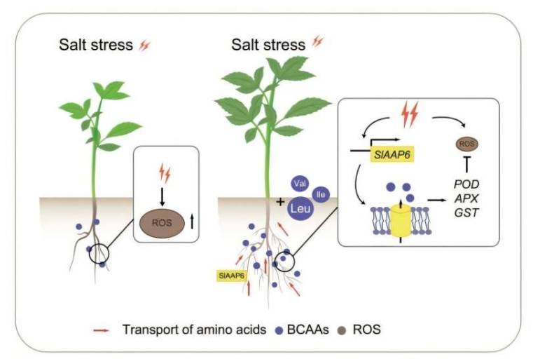 Los resultados experimentales muestran que la sobreexpresión de SlAAP6 aumenta significativamente los niveles de aminoácidos de cadena ramificada (BCAA) en raíces y tallos, promueve la acumulación de biomasa y eleva el contenido de nitrógeno; mientras que los mutantes de eliminación muestran deficiencia en la absorción de aminoácidos y retraso en el crecimiento. Bajo estrés salino, en comparación con el tipo silvestre y los mutantes, las líneas de sobreexpresión de SlAAP6 exhiben mayor elongación de raíces, menor acumulación de especies reactivas de oxígeno (ROS). Además, la aplicación exógena de aminoácidos de cadena ramificada (BCAAs), especialmente leucina, mejora aún más la tolerancia a la salinidad en plantas de sobreexpresión de SlAAP6, pero no rescata los defectos de crecimiento en mutantes. El análisis molecular detallado indica que la activación de SlAAP6 mejora la expresión de genes relacionados con la proliferación radicular y la defensa antioxidante, destacando su rol dual en el transporte de nutrientes y la mitigación del estrés.