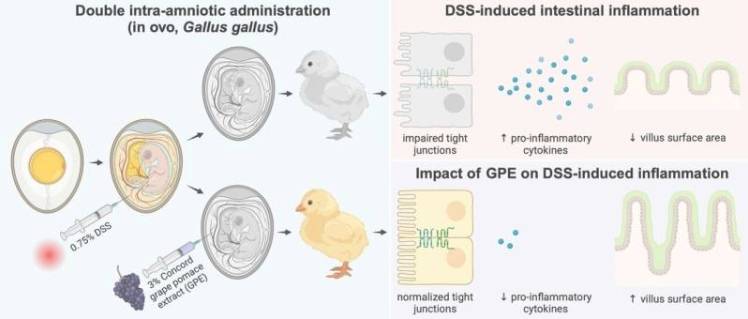 Para llegar a conclusiones, los investigadores inyectaron un inductor de inflamación en el líquido amniótico de huevos de gallina, seguido de una intervención con extracto de orujo de uva. El estudio mostró que los extractos de orujo de uva mejoran los síntomas de inflamación intestinal y la salud intestinal, requiriendo más investigación para optimizar su efecto antiinflamatorio. La profesora Huang dijo que la fibra y los polifenoles en sí pueden influir en la inflamación, y se necesita identificar los compuestos específicos en el orujo de uva que causan esta diferencia.