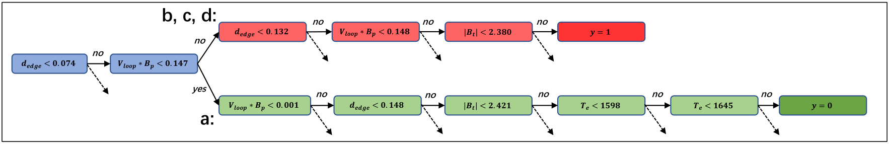 En la investigación de predicción de disrupciones por modo bloqueado, el grupo de temas adoptó un método de aprendizaje automático "ante-hoc" de interpretabilidad. Este método utiliza la transparencia inherente del modelo de árbol de decisión (Decision Tree), no solo para "saber qué", sino también para "saber por qué". El "modelo de predicción interpretable" desarrollado por el equipo alcanza un área bajo la curva característica operativa del receptor (AUC) de 0,997 en el conjunto de prueba y revela exitosamente las cantidades físicas clave que llevan a las disrupciones por modo bloqueado. En esta base, para satisfacer las necesidades de experimentos reales, el equipo desarrolló además un "modelo de predicción en tiempo real", logrando una tasa de advertencia exitosa del 94% y un tiempo de advertencia promedio de 137 milisegundos, lo suficientemente para satisfacer las necesidades de advertencia de disrupciones de ITER. Esta investigación no solo puede proporcionar advertencias confiables de disrupciones para EAST, sino que también proporciona una referencia para una comprensión profunda del proceso físico de las disrupciones a través del análisis de interpretabilidad.