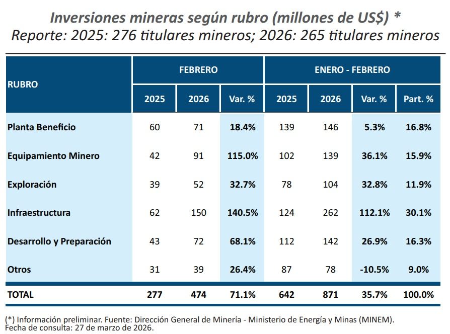 En el período de enero a febrero de 2026, la inversión minera acumulada en Perú alcanzó los 871 millones de dólares, un crecimiento del 35,7% frente a los 642 millones del mismo período en 2025. Este resultado se debió al fuerte crecimiento en infraestructura (+112,1%), equipos de minería (+36,1%) y exploración (+32,8%), junto con aumentos en desarrollo y preparación (+26,9%) y planta de beneficio (+5,3%), mientras que la categoría "otros" (-10,5%) se contrajo.